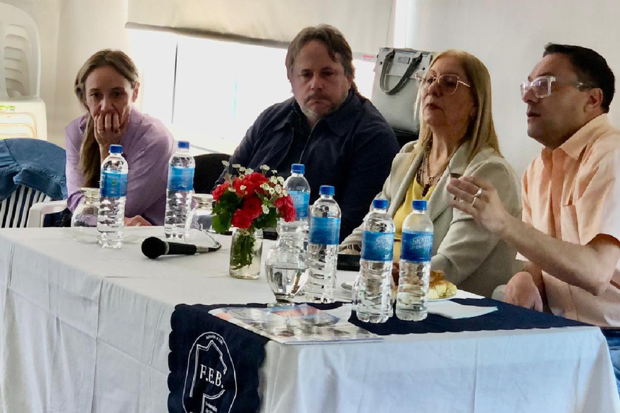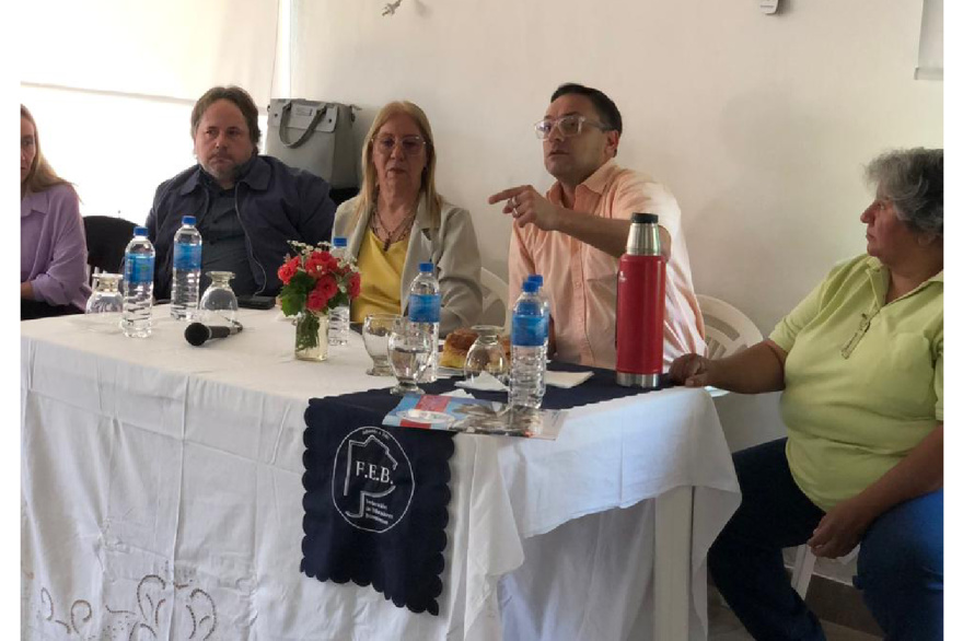 La presidente de la FEB Liliana Olivera y el vicepresidente Ezequiel Majul, participaron ayer en Florentino Ameghino de la Jornada “Una mirada docente desde lo legal y lo gremial”, a cargo del asesor legal del gremio Dr. Víctor Nanni.